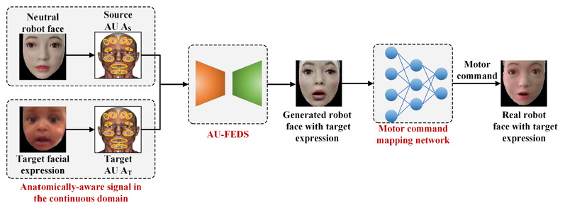图1:系统框架:连续域中的解剖级AU分布标签被检测为源AU AS和目标AU AT,将AS、AT和中性机器人面孔输入到AU-FEDS中,以生成具有目标表情的机器人面孔,随后将其输入到运动指令映射网络,以获得机器人的面部运动控制指令