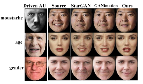 图4:在带有身份干扰下使用不同方法生成面部表情结果图