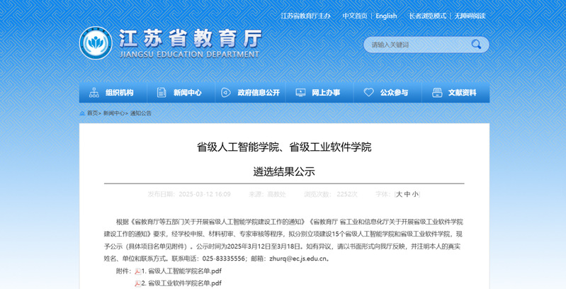 3月12日,江苏省教育厅发布省级人工智能学院、省级工业软件学院遴选结果公示,拟立项建设15个省级人工智能学院,yl88858cc永利官网入选。