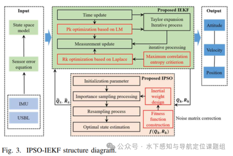 (1) 针对水下导航系统的非线性问题,本文提出一种迭代扩展卡尔曼滤波算法(IEKF)。一方面,基于迭代原理构建了IEKF算法,并基于LM算法优化IEKF状态向量的均方误差矩阵;另一方面,基于拉普拉斯原理重构IEKF的测量噪声方差矩阵。所提出的IEKF算法具有更强的鲁棒性。