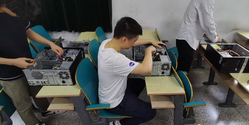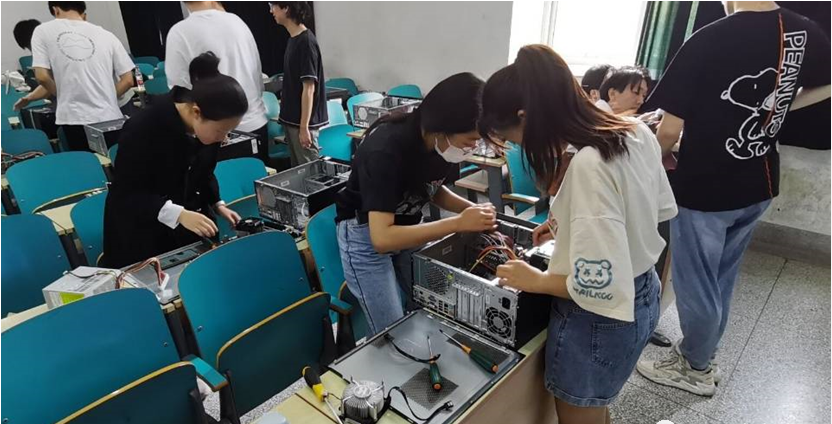 主讲人为参加此次培训的同学们详细讲解了一台主机中各个部件的作用以及拆卸和安装方法,并当场示范了一台电脑的拆解和组装过程。讲解结束后,同学现场分组练习拆装计算机主机,科协培训人员为同学们进行答疑解惑。
